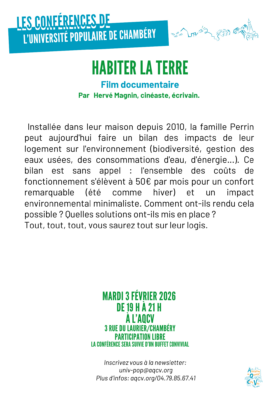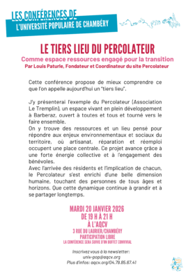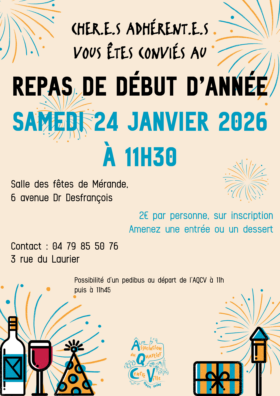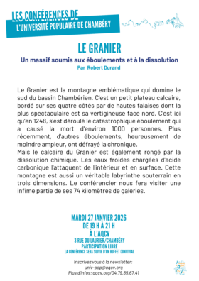 voir programme décembre 2025 et janvier 2026 Programme de fin d’année : décembre 25 et janvier 26 19h Mardi 20 janvier 2026 Conférence de l’Université Populaire à 11h30 Samedi 24 janvier 2026 Repas de début d’année 2026 19h Mardi 27 janvier 2026 Conférence de l’Université Populaire voir programme De février à mars 2026 Les programmes de février-mars sont sortis 19h Mardi 3 février 2026 Conférence de l’Université Populaire 14h jeudi 26 février 2026 Projection ciné-débat