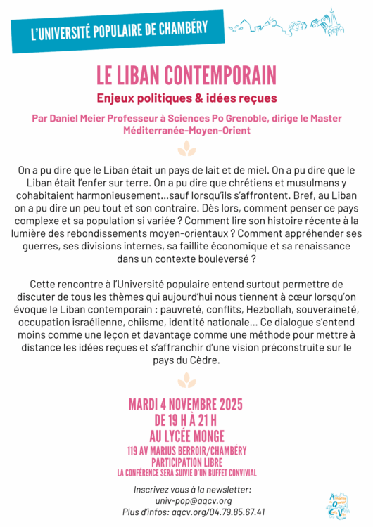 Pour être mis au courant des prochaines conférences, vous pouvez vous abonnez à la newsletter de l’Université Populaire en envoyant un mail à univ-pop@aqcv.org
