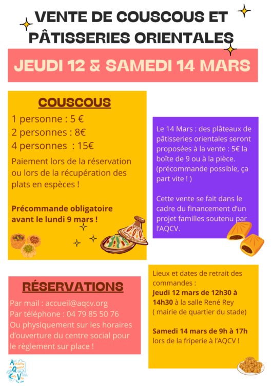 Samedi 14 mars : retrait des commandes de couscous + pâtisseries à l’AQCV lors de la friperie de 9h à 17h.